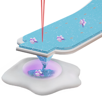 Figure 4- Force-controlled nano-injection into an individual cell. The microfluidic cantilever enables the direct delivery of molecules, proteins, RNA or genome-editing complexes into selected cells with high spatial precision.