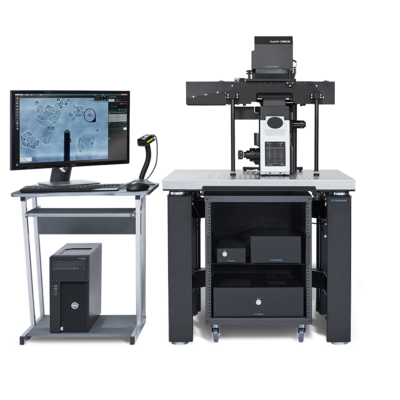 Figure 1 & 2- FluidFM Omnium platform for single-cell manipulation. The system integrates atomic force microscopy with microfluidic pressure control, allowing researchers to interact with individual living cells using a hollow cantilever probe. The probe functions as a force-controlled nanopipette and can inject molecules, extract cytoplasm, apply compounds locally or measure mechanical properties of single cells.